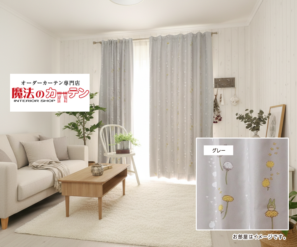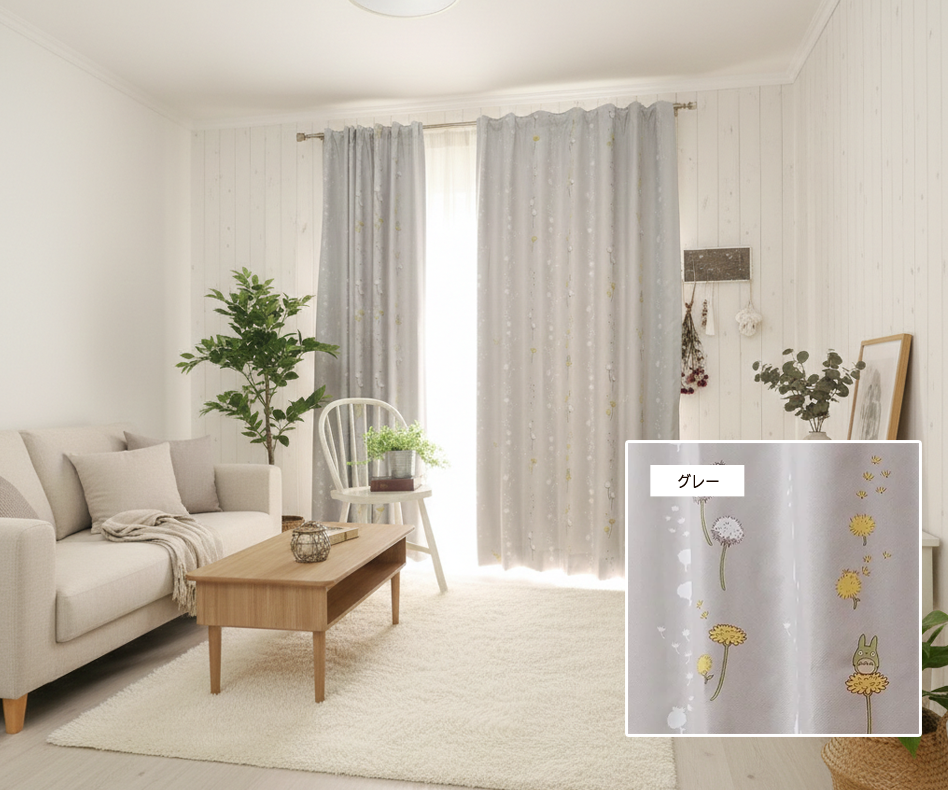 たんぽぽふわり グレー 春風にふわりと揺れるカーテンには、たんぽぽに乗ってお空をお散歩するトトロの姿が。ちょこんと乗ったその愛らしさに思わずほっこり。明るい黄色のたんぽぽがアクセントになり風に乗って優しい空気を運んできてくれるような、心癒されるデザインです。 |