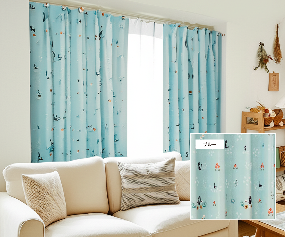 アンフルール ブルー お花畑で元気に遊ぶジジの姿を描いた、華やかでロマンチックな遮光カーテン。キキと離れて少し寂しくなったジジも、カラフルなお花に囲まれてご機嫌にお散歩中。まるでお部屋に花が咲いたような明るいデザインが、毎日をちょっぴりハッピーに彩ってくれます。夢と癒しが詰まった1枚です。 |