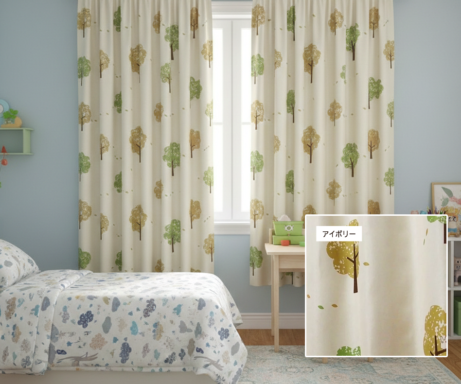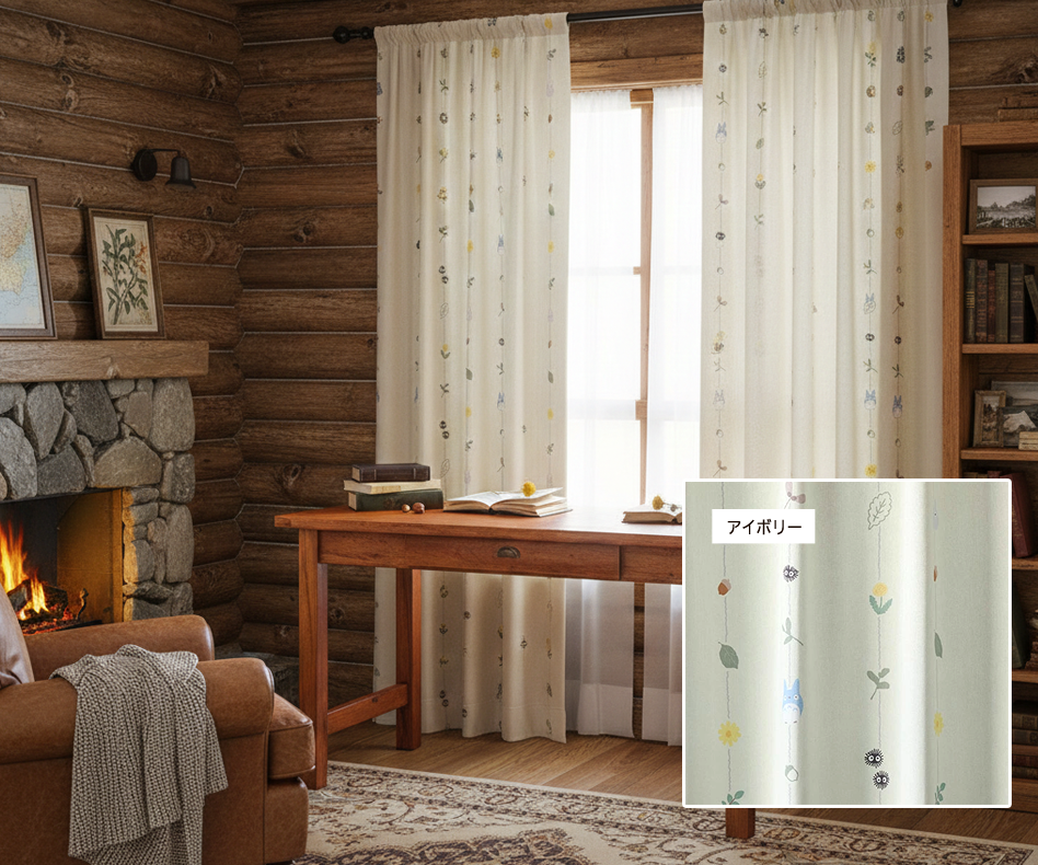くすの木と風 アイボリー 風にそよぐクスノキの下で、トトロが静かにひと休み。まるで映画のワンシーンを切り取ったようなデザインは、窓辺に広がるジブリの世界。物語の続きをそっとのぞき見るような穏やかな時間が流れ、見ているだけで心がふっと休まる、そんな癒しのひと幕を描いたカーテンです。 |